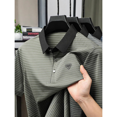 翻领桑蚕丝短袖t恤男士夏季冰丝凉爽条纹polo衫商务男装夏天体恤