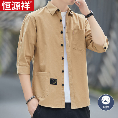 恒源祥夏季工装薄衬衫男七分袖纯棉男装宽松潮流休闲短袖衬衣外套