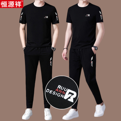 恒源祥桑蚕丝男士休闲运动服套装男短袖帅气搭配潮流冰丝男装夏装