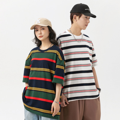 复古日系港风情侣条纹短袖T恤夏季圆领休闲体恤男装撞色潮牌百搭t