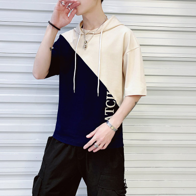 2025夏季短袖T恤男透气五分袖潮流男装休闲拼色连帽英文中袖T恤男