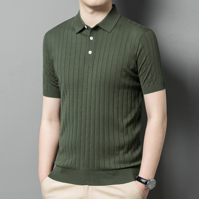 专柜桑蚕丝短袖t恤男夏季新款商务休闲翻领中年爸爸条纹上衣可批发定制工作服加肥加大码男装新款夏季真丝短袖体恤衫