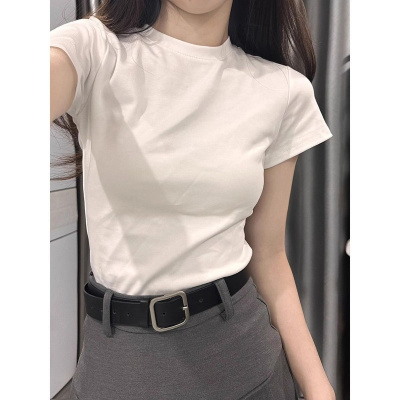 含棉 圆领短款短袖T恤女夏季新款设计感小众高腰收腰纯色上衣