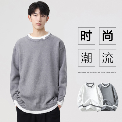 圆领男装毛衣春秋季新款假两件潮牌长袖打底衫内搭毛线男士针织衫