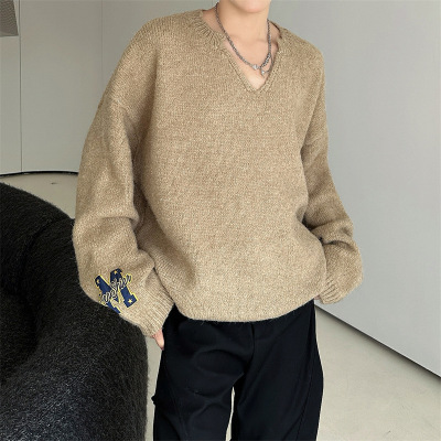 男装日系复古慵懒风V领简约中性毛衣街头潮牌宽松百搭套头针织衫