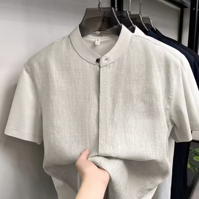 100%亚麻短袖衬衫男2026夏季新款中年爸爸装立领休闲透气男士衬衫