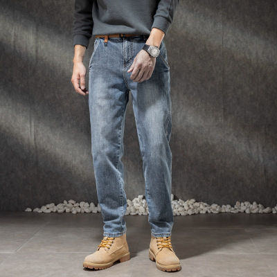 宽松男士弹力直筒裤男装春季新款常规复古磨白丝光棉牛仔长裤子男