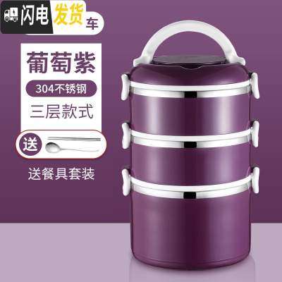 三维工匠保温饭盒 304不锈钢三层便当盒学生超长保温桶家用大容量多层提锅 304三层饭盒葡萄紫[送筷子勺子]
