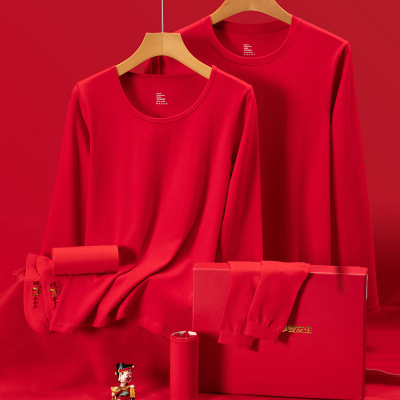 OEM定制大红色本命年保暖内衣男女秋冬保暖套装纯棉秋衣秋裤盒装