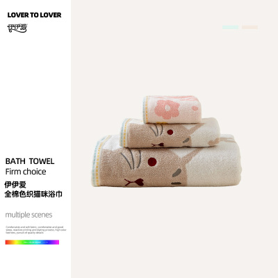 伊伊爱 全棉色织猫咪浴巾