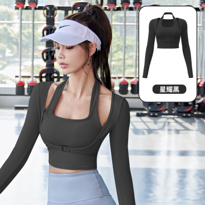 挂脖免穿文胸瑜伽服假两件运动上衣外穿健身衣