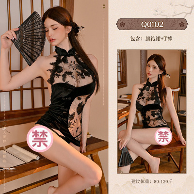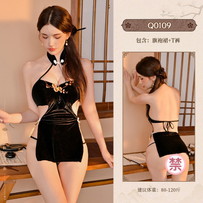 九里晴川中式性感改良开叉旗袍中式纯欲挂脖露背刺绣情趣内衣 九里晴川Q0109[刺绣高叉旗袍-黑] 均码