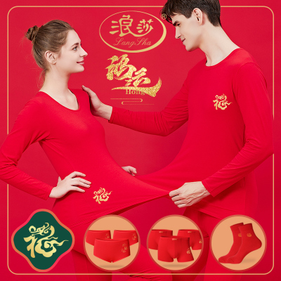 浪莎红色本命年男士秋衣卫生裤套装女蛇年莫代尔内衣棉毛衫保暖衣服