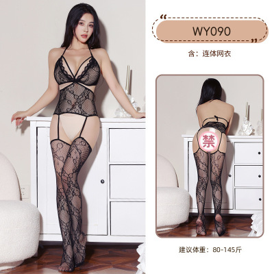 九里晴川WY090无裆花纹连体网衣申深V性感成熟蕾丝镂空吊带连体衣 九里晴川WY090[无裆花纹连体网衣] 均码