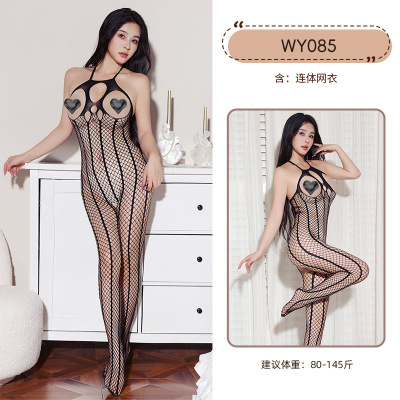 九里晴川WY085挖空连体衣开裆挂脖深V条纹网格镂空情趣连体衣分销 九里晴川WY085[挖空连体衣-开裆-黑] 均码