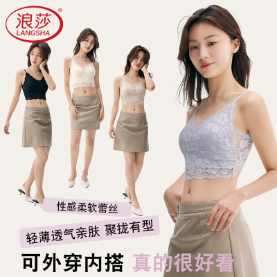 浪莎细肩带内衣女小胸聚拢夏季薄款内搭外穿一体蕾丝防走光文胸罩_062336
