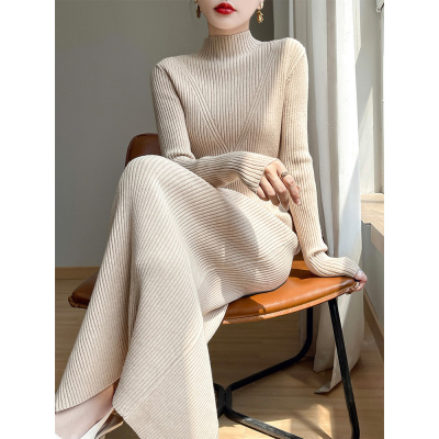 秋冬新款安迪绒针织过膝长裙女半高领气质坑条纯色包臀修身连衣裙