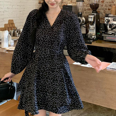 茶歇法式文艺复古波点长袖V领绑带连衣裙女春秋季新款a字短裙