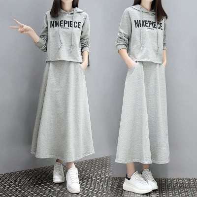 港风复古套装裙女显瘦百搭气质连帽长袖T恤女装连衣裙两件套