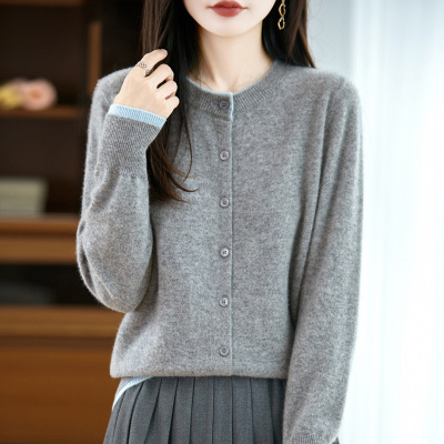 撞色圆领全羊毛针织开衫女装系扣长袖外套宽松显瘦新款气质开衫