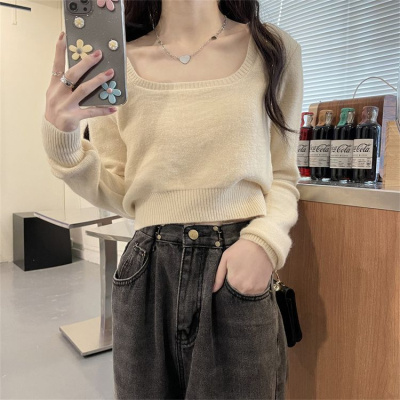 方领内搭长袖针织衫女装新款春秋季设计感小众高腰短款打底上衣潮