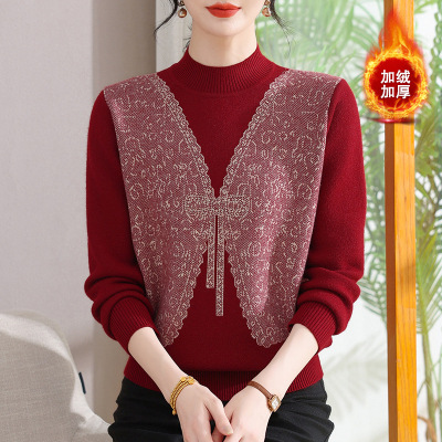 妈妈秋冬装一体绒国风旗袍领毛衣女保暖上衣中老年加绒加厚打底衫