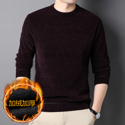 源头厂家雪尼尔毛衣男冬季圆领纯色净版加绒保暖打底针织衫男