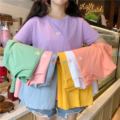 心形刺绣短袖T恤女夏季新款宽松女士打底衫上衣 韩国女装