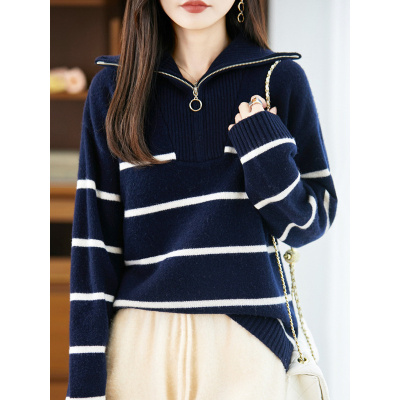 秋冬韩版新款宽松时尚高领撞色休闲毛衣女条纹套头针织衫外套拉链