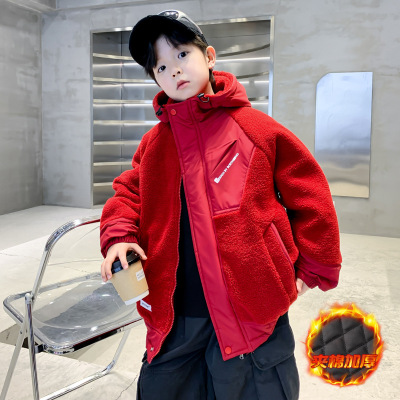 男童夹棉外套秋冬款新款儿童装红色毛毛衣年服冬季加厚羊羔绒