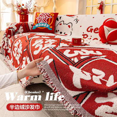 红色喜庆沙发盖布巾新款冬季加厚毛绒盖布一整张防滑全盖毯子