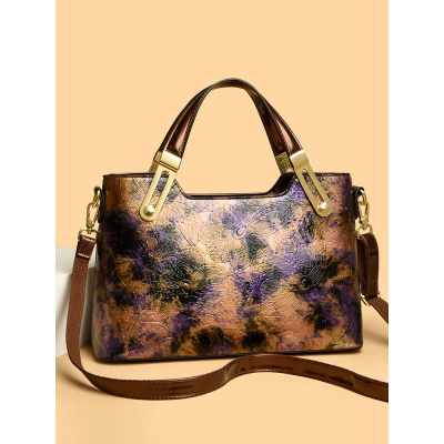 手提包女新款包包中国风单肩包大容量喷绘花纹托特包亮皮