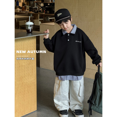 童酷男童秋款湖州织里童装字母刺绣格子假两件翻领儿童卫衣潮