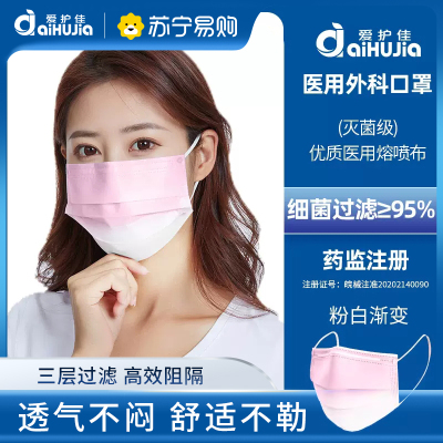 爱护佳医用外科一次性成人医疗口罩医护防护级三层灭菌级透气舒适 粉白色10包100片