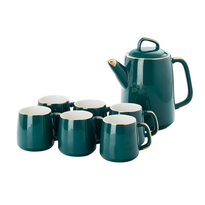 富昱景 北欧轻奢手工描金陶瓷凉水壶耐热茶具简约水具托盘套装水具家用 送礼结婚礼品礼盒(孔雀蓝一壶六杯)
