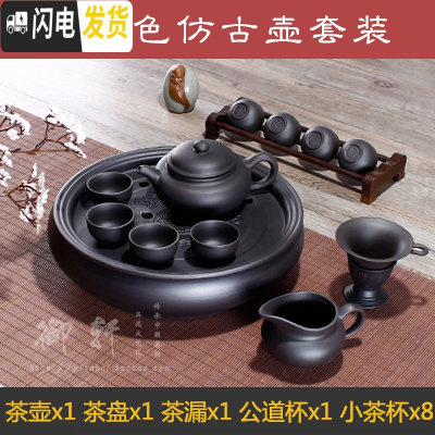 三维工匠宜兴紫砂功夫茶具套装茶壶茶杯茶盘整套全手工陶瓷盖碗家用泡茶器 纯黑色仿古壶套装8小杯