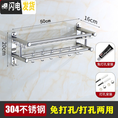 三维工匠卫生间置物架2层免打孔不锈钢304浴室放衣服用品收纳架厕所吸壁式 F款双层50cm[免打孔两用]304浴室置物架