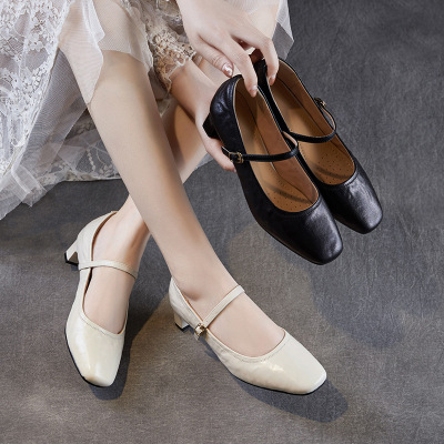简约方头羊皮粗跟高跟鞋百搭米白色一字扣带单鞋时尚浅口真皮女鞋
