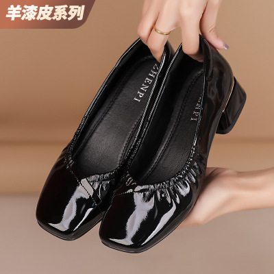 25春秋季新款气质粗跟方头漆皮通勤浅口女鞋时尚四季软底粗跟女鞋