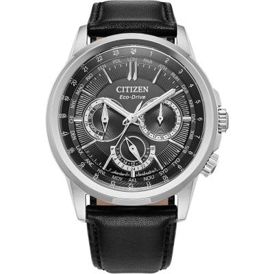 西铁城(CITIZEN)光动能商务经典日历手表黑皮表带黑盘男士防水多功能石英腕表