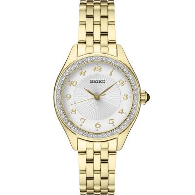 SEIKO/精工 水晶系列女士手表 时尚百搭优雅气质三针镶晶表圈圆盘金色钢带商务休闲石英表