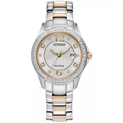 西铁城(CITIZEN)光动能三眼石英女款手表30mm银色表盘水晶点缀日期显示