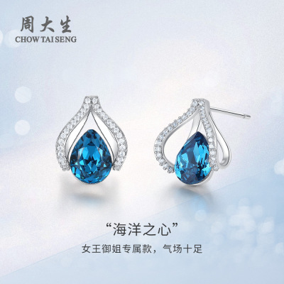 周大生S925银饰电镀K金锆石海洋之心耳饰