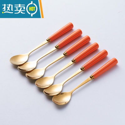 敬平北欧水果叉勺月饼刀叉创意家用不锈钢水果签咖啡勺陶瓷收纳罐套装 橙色金勺六只装