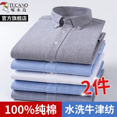 啄木鸟纯棉牛津纺白色男士衬衫短袖2025夏季免烫工装爸爸长袖衬衣