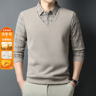 冬季含羊毛蚕丝男士假两件加绒加厚保暖衬衫领印花打底针织衫男_300814