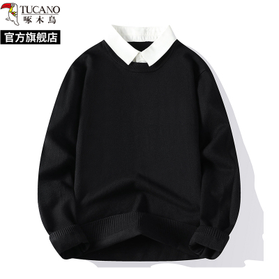 啄木鸟春秋冬季新款假两件衬衫领商务针织毛衣男士保暖内搭打底衫