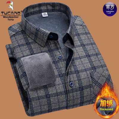 啄木鸟棉保暖衬衫男长袖冬季休闲格纹棉拉毛中老年丝绒加厚衬衫