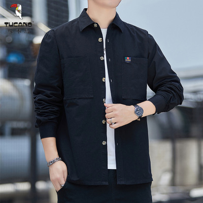 啄木鸟男士长袖免烫衬衫秋季工装宽松厚衬衣外套休闲多口袋纯棉潮