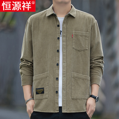 恒源祥春秋新款纯棉灯芯绒衬衫男士长袖条绒外穿休闲工装衬衣外套